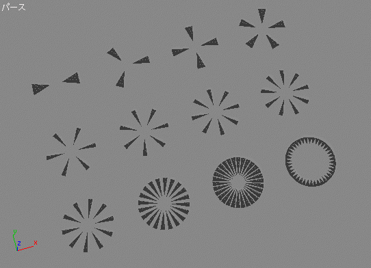 num_faces type:#integer ui:num_faces default:10num_faces オブジェクト プロパティは、オブジェクト内の「光線」の数、実際には平面数をコントロールします。これは整数であり、UI 内の同じ名前のスピナーに対応しています。平面の既定の数は 10 です。