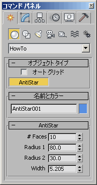 このプラグインを使用するには、[作成] (Create)パネル > [ジオメトリ] (Geometry) > [HowTo]をクリックして表示される[AntiStar]ボタンをクリックします。ビューポート内をクリックして中心を定義し、ドラッグして外側の半径を定義します。再度クリックおよびドラッグして内側の半径を定義し、もう一度クリックおよびドラッグして幅を定義します。クリックして終了するか、右クリックしてキャンセルします。