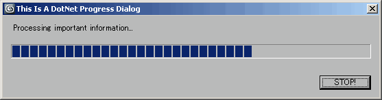 theObj = dotNetObject "MaxCustomControls.ProgressDialog" theObj.Show() theObj.text = "This Is A DotNet Progress Dialog" theObj.Controls.Item[0].text = "STOP!" theObj.Controls.Item[1].text = "Processing important information..." theObj.Controls.Item[2].value = 65