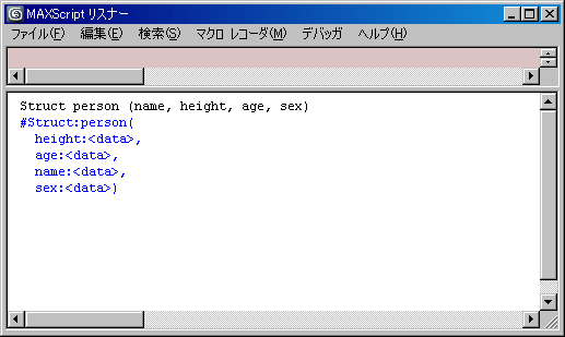 MAXScript の「構造体定義」を使用することにより、カスタム関数だけでなく、カスタムの合成値も作成できます。構造体定義は、単純なデータ型から作成される、柔軟性に富んだデータ型です。新しい構造化タイプの値のレイアウトを定義し、コード内でそれを作成および操作できます。
