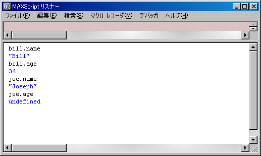 Joe = person name:"Joseph" sex:#maleこの例では、もう 1 つの「person」が作成されます。ただし、この person には、height と age メンバー用に初期化された値はありません。構造体定義でメンバーにオプションの既定値を指定しなかったため、既定値は undefined になります。