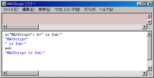 文字列を使って簡単な数学演算を実行することもできます。たとえば、a="MAXScript"b=" is fun!" を定義した場合、a+b と入力すると "MAXScript is fun!" が返されます。