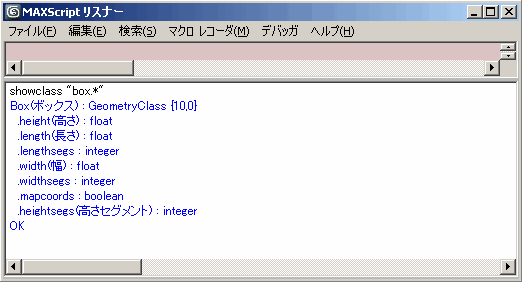 ボックス パラメータをすべて表示させるために、「」をワイルドカードとして使うことができます。`showClass "box.,"と入力すると、Box` *および BoxGizmo クラスのすべてのパラメータがリストされます。
