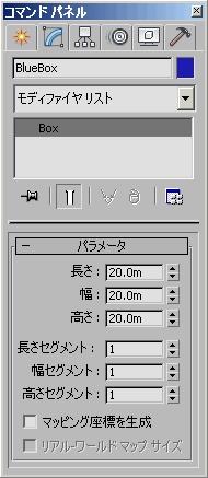 [パラメータ] (Parameters)ロールアウトには、ボックスのすべての作成パラメータが表示されます。ロールアウト内のスピナーを使ってそれらのパラメータを変更できます。長さ、幅、高さセグメントの値や、MAXScript のマッピング座標の設定を変更したい場合は、これらのパラメータの構文を知っておく必要があります。すべてのパラメータ設定の構文を検索するには、2 つの異なる調査関数を使用します。