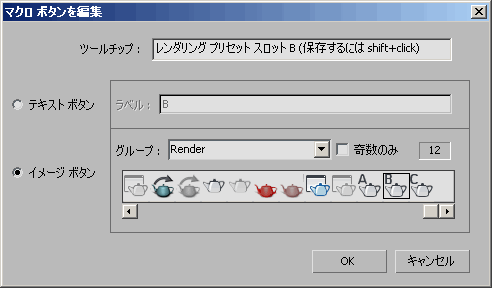 ユーザは、ボタン モードを[イメージ ボタン]に切り替え、ドロップダウン リストからアイコン ライブラリを選択して (たとえば「レンダリング」)、リストから新しいアイコンを選択できます。