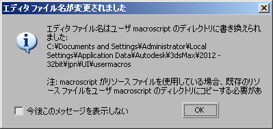 3ds Max に付属する「ファクトリ」 MacroScript を開くと、\macroscripts フォルダから現在のユーザのローカル AppData フォルダである \usermacros フォルダにファイルがコピーされ、コードのカスタム変更が可能になります。\usermacros フォルダに格納されるスクリプトは、ファクトリ スクリプトの後で評価されるので、ファクトリ スクリプトを上書きします。次の警告が既定で表示されます(左下隅のチェック ボックス オプションで無効にしていない場合)。