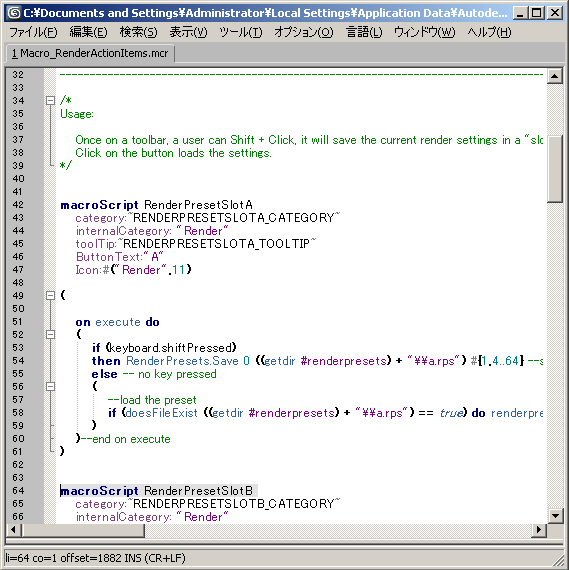 たとえば、[Render Presets Slot B]ボタンのソース コードを MAXScript エディタで表示すると次のようになります。 マクロ スクリプトの最初の行が自動的に強調表示されています。