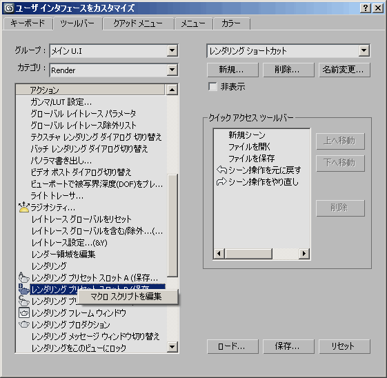 3ds Max 4 では、アクション項目システムが統合され、カスタマイズ ダイアログ ボックスの 4 つの主要な領域 (キーボード ショートカット、ツールバー、メニュー、およびクアッドメニュー) すべてにマクロ スクリプトを表示できるようになりました。