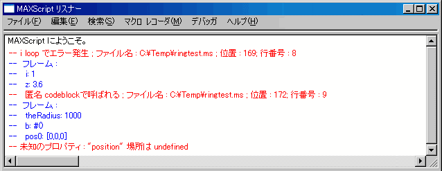 MAXScript がスクリプト内でランタイム エラーを検出すると、リスナー出力領域にエラー メッセージが表示され、説明が出力されます。