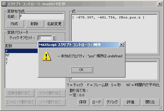 この種のエラーを回避する適切な方法としては、Box001 の位置トラックが割り当てられた変数を使用します。Box001 を削除してもコントローラにエラーは発生しません。追加ボーナスとして、Box001 が Z に沿って自動的に移動する際に、コントロールされたオブジェクトの位置が更新されます。