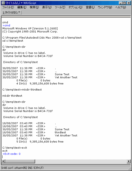 出力ペインの標準的な機能の一部は、3ds Max でも使用できます。たとえば、「cmd」と入力すると、Windows コマンド シェル が起動され、MS Windows のスタンドアロン シェルで提供されているすべての DOS コマンドが使用できます。