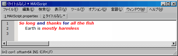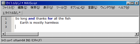 新規スクリプトを作成して、次の文字列を入力します。[So long and thanks for all the fish.(改行) Earth is mostly harmless]