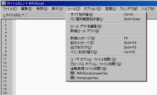 3ds Max 2008 で導入された タブ付きの MAXScript エディタ の[ツール]メニューには、スクリプト評価、Visual MAXScript エディタへのアクセス、およびエディタの機能を定義するさまざまなオプション ファイルやプロパティ ファイルを編集するためのコマンドがあります。