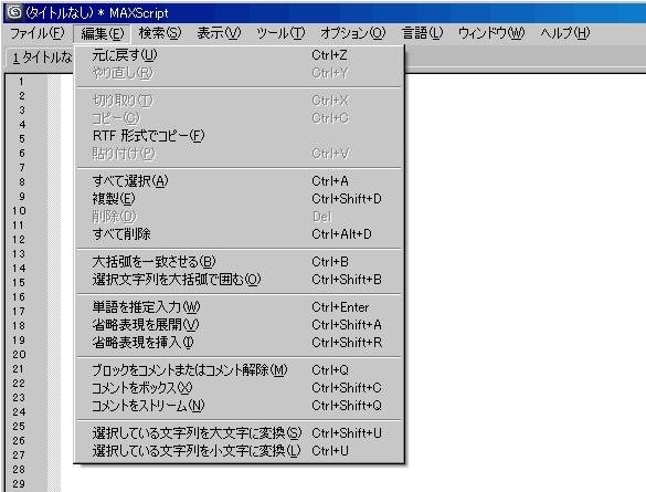 3ds Max 2008 で導入された タブ付きの MAXScript エディタ の編集メニューには、変更の取り消し/やり直し、テキストのコピー、削除、選択を行うコマンド、ブラケットの一致、単語の推定入力、コメント化、大文字小文字変換などのツールがあります。