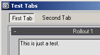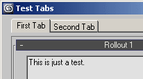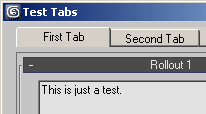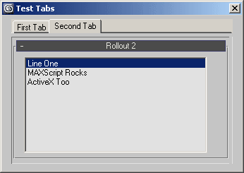 ( rollout firstRollout "Rollout 1" ( edittext edittext01 text:"This is just a test." height:135 width:262 ) rollout secondRollout "Rollout 2" ( listbox listbox02 items:#("Line One","MAXScript Rocks","ActiveX Too") width:260 ) rollout testTabs "Test Tabs" ( activeXcontrol ax_tabs "MSComctlLib.TabStrip.2" height:20 subRollout theSubRollout height:180 on ax_tabs Click do ( case ax_tabs.SelectedItem.index of ( 1: ( removeSubRollout theSubRollout secondRollout addSubRollout theSubRollout firstRollout ) 2: ( removeSubRollout theSubRollout firstRollout addSubRollout theSubRollout secondRollout ) ) ) on testTabs open do ( ax_tabs.tabs[1].caption = "First Tab" ax_tabs.tabs.add pvCaption:"Second Tab" ) )--end rollout createDialog testTabs 340 220 addSubRollout testTabs.theSubRollout firstRollout )