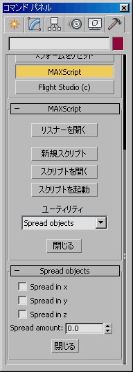 ここでは、現在選択したものにオブジェクトの位置を展開するユーティリティを実装する簡単な例を挙げます。この例では、 Spread objects エントリを[ユーティリティ] (Utilities)リストにインストールします。Spread objects ロールアウトを開くと、3 つのチェック ボックスと 1 つのスプレッド量スピナーがあります。スプレッド スピナー イベント ハンドラは、ユーザがスピナーを調整するときは必ず呼び出されます。イベント ハンドラ式では選択したオブジェクトの新しい位置が計算され、スプレッドを制御するために各チェック ボックスの状態がテストされます。