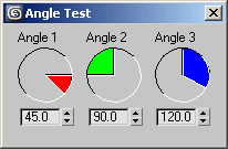 rollout test "Angle Test" ( Angle ang1 "Angle 1" diameter:50 align:#left range:[-180,180,45] startdegrees:0 dir:#cw color:red across:3 Angle ang2 "Angle 2" diameter:50 align:#center range:[0,270,90] startdegrees:90 dir:#ccw color:green Angle ang3 "Angle 3" diameter:50 align:#right range:[0,360,120] startdegrees:270 dir:#cw color:blue spinner val1 fieldwidth:40 align:#left across:3 range:[-180,180,45] spinner val2 fieldwidth:40 align:#center range:[0,270,90] spinner val3 fieldwidth:40 align:#right range:[0,360,120] on ang1 changed val do val1.value = val on ang2 changed val do val2.value = val on ang3 changed val do val3.value = val on val1 changed val do ang1.degrees = val on val2 changed val do ang2.degrees= val on val3 changed val do ang3.degrees= val ) createdialog test 200 110