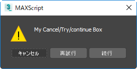 cancelTryContinueBox <message_string> [optional arguments - [see below] ](GUID-7A4AA91A-0DEB-470B-AD6B-2E7A3A105BD0.html)[キャンセル] (Cancel)、[再試行](Try Again)、および[続行] (Continue)ボタンを含むモーダル メッセージ ボックスを表示します。このダイアログは、ユーザが選択したボタンに応じて #cancel、#tryAgain、または #continue を返します。 3ds Max 2020.1 Update 以降で使用可能です。