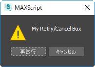 retryCancelBox <message_string> [optional arguments - [see below] ](GUID-7A4AA91A-0DEB-470B-AD6B-2E7A3A105BD0.html)[再試行] (Retry)および[キャンセル] (Cancel)ボタンを含むモーダル メッセージ ボックスを表示します。このダイアログは、ユーザが選択したボタンに応じて #retry または #cancel を返します。3ds Max 2020.1 Update 以降で使用可能です。