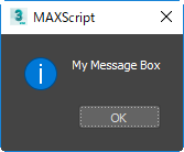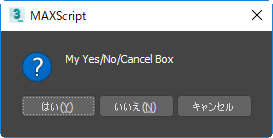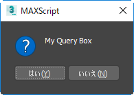 これらの関数を使用すると、MAXScript 内からメッセージ ボックスや「はい/いいえ」の問い合わせダイアログ ボックスを表示できます。