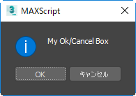 okCancelBox <message_string> [optional arguments - [see below] ](GUID-7A4AA91A-0DEB-470B-AD6B-2E7A3A105BD0.html)[OK]および[キャンセル] (Cancel)ボタンを含むモーダル メッセージ ボックスを表示します。このダイアログは、ユーザが選択したボタンに応じて #ok または #cancel を返します。3ds Max 2020.1 Update 以降で使用可能です。