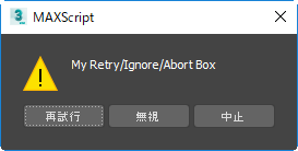 retryIgnoreAbortBox <message_string> [optional arguments - [see below] ](GUID-7A4AA91A-0DEB-470B-AD6B-2E7A3A105BD0.html)[再試行] (Retry)、[無視] (Ignore)、および[中断] (Abort)ボタンを含むモーダル メッセージ ボックスを表示します。このダイアログは、ユーザが選択したボタンに応じて #retry、#ignore、または #abort を返します。 3ds Max 2020.1 Update 以降で使用可能です。