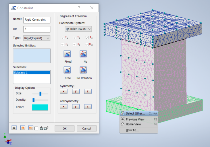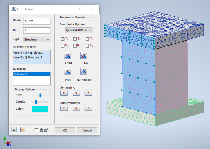 これは 1/4 対称モデルであるため、ビレットと上部プレートの垂直面を X 方向および Z 方向に拘束します。