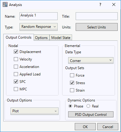 - [PSD 出力コントロール]: ランダム応答/振動疲労解析では、このオプションは節点および要素の出力として表示されます。