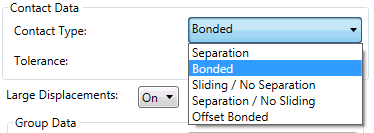 - [接触タイプ]: CAD モデルを使用して自動接触を定義するために、[分離]、[結合]、[スライド/分離なし]、[分離/スライドなし]、[オフセット結合]を利用できます。