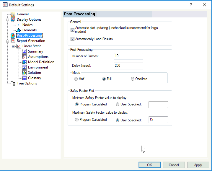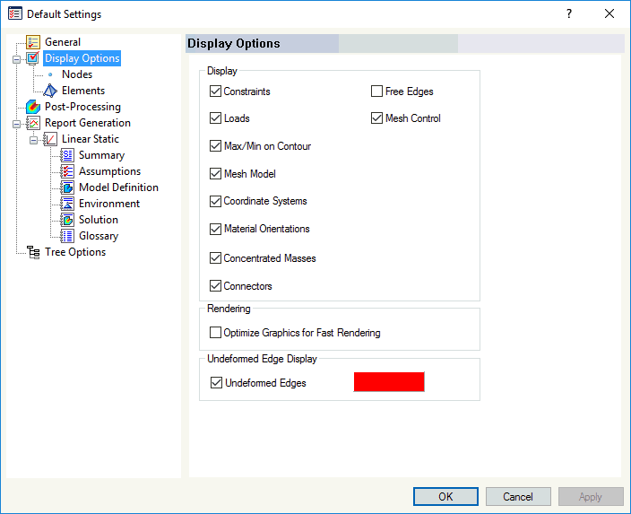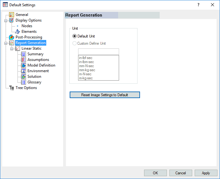 [既定の設定]ウィンドウは、Autodesk Nastran モデル ツリーの空の領域を右クリックし、[既定の設定]を選択してもアクセスできます。