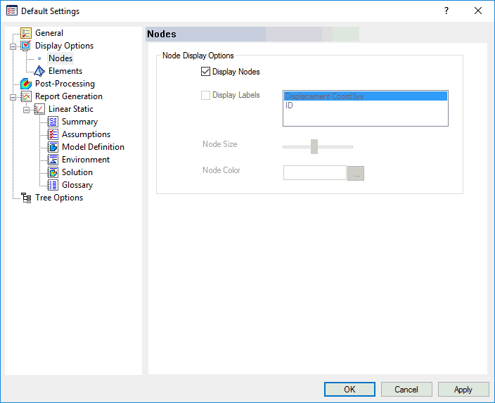 - [節点]: モデル内の節点の表示設定を定義します。変位の座標系または ID タグを使用した節点の表示を選択できます。サイズと色を変更することもできます。