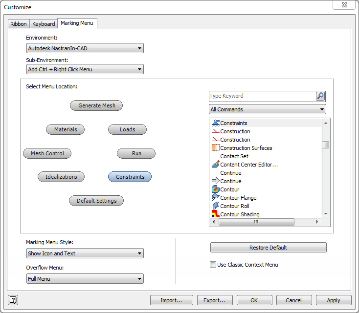 Autodesk Inventor Nastran にはマーキング メニューがあり、ネイティブの Autodesk Inventor のマーキング メニューと同じレイアウトです。Inventor Nastran マーキング メニューは、Autodesk Inventor と同様に、コマンドを追加および除去することにより、およびボタンの位置を変更することによりカスタマイズすることができます。Autodesk Inventor Nastran 環境で、モデルを開きます。キャンバスで右クリックすると、次のメニューが表示されます。