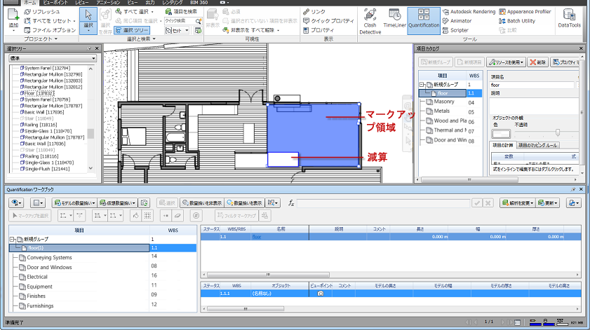 減算機能を使用して、ジオメトリの一部を切り取ります。減算を描画することで、既存の領域数量拾いの一部を除外できます。減算は、たとえば、数量拾いのために床の領域をマークアップしたが、そこに含まれるコリドー領域を除外したい場合などに役立ちます。Quantification ワークブックで廊下の減算領域は床の領域から「減算」されます。