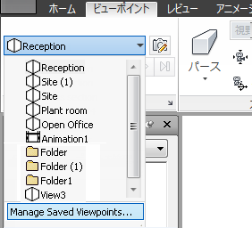 1. [ビューポイント]タブ [保存、ロード、再生]パネル [現在のビューポイント]ドロップダウン リスト [保存されたビューポイントを管理]をクリックします。