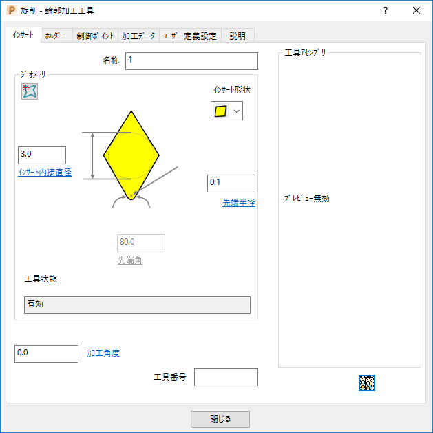 インサート タブを使用し、旋削工具の加工部のジオメトリを定義します。旋削工具タイプにより、有効になるオプションが異なります。