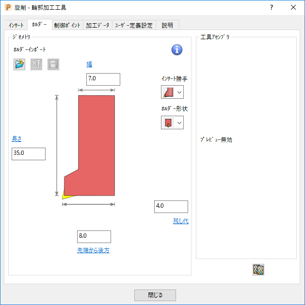 工具 ダイアログ ホルダー タブを使用し、工具のホルダー部を定義します。ツールパスは、工具ホルダー との接触を回避します。