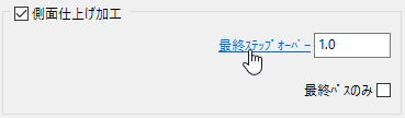 この例では、ダイアログ内の値の計算方法を説明します。ここでは、モデル領域切削 ストラテジーダイアログ 側面仕上げ加工 ページに値を入力します。