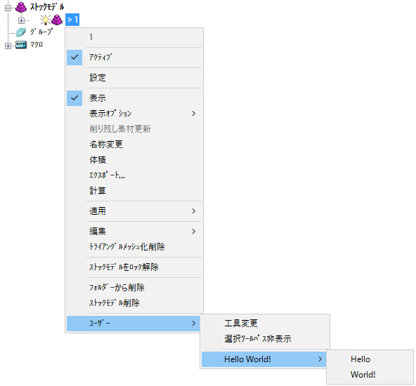 たとえば、「Hello World!」という名称にスペースを含む ユーザー メニューおよびサブメニューを作成します。