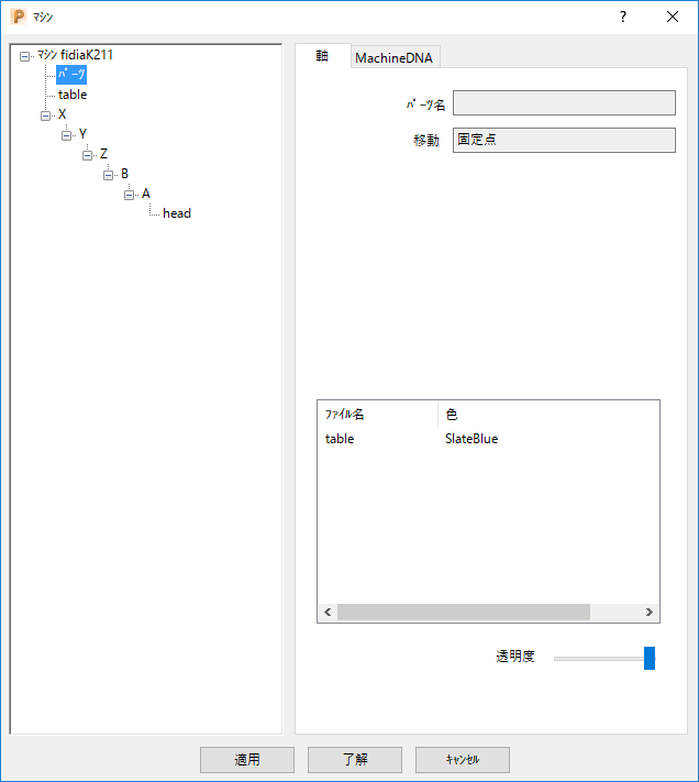 - 透明度 スライダーを移動し、マシン、または、選択マシンパーツの透明度を制御します。 スライダーを左に移動して透明度を削減し、スライダーを右に移動して透明度を増加します。