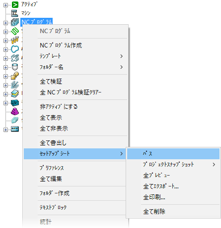- NC プログラム コンテキスト メニューから [セットアップ シート] > [パス] を選択します。