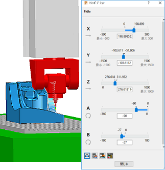 - [ダイナミック マシン制御] タブ > [編集] パネル > [ツールパス更新] をクリックし、マシンの新規ポジション、および、工具軸を更新します。