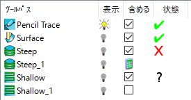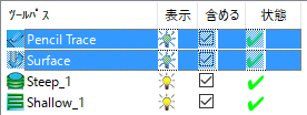 ツールパス一覧 - 当該工具を使用する全ツールパスおよび当該工具による加工内の干渉の有無を表示します。リストには、以下の 4 項目が表示されます。