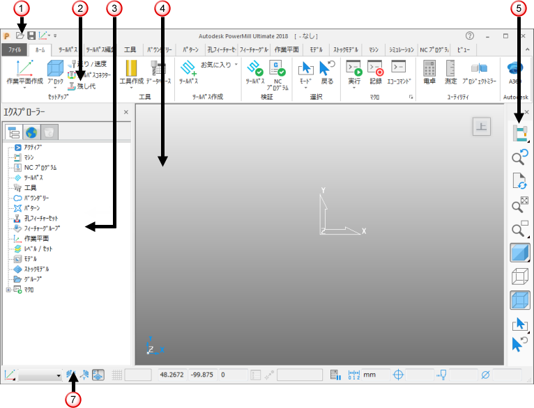 リボン - PowerMill の機能を管理する、複数のタブとパネルから構成されます。