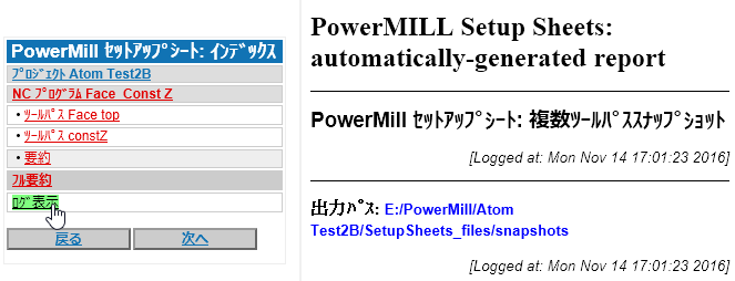セットアップ シート ログは setupsheets_log.html という名前です。これは、セットアップ シート操作(プレビューやエクスポートなど)の際に 情報 ダイアログに表示されるメッセージをタイムスタンプ順に並べるために使用します。