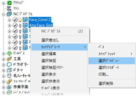 セットアップシートのプレビュー方法 - 選択 NC プログラム