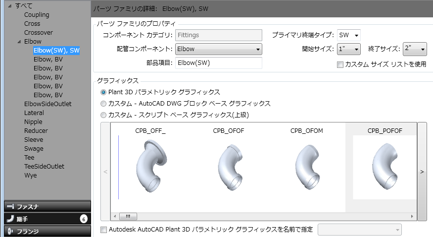 左側のペインでコンポーネントのカテゴリ(例: 継手)とタイプ(例: エルボ)を選択して、右側のペインにパーツ ファミリの詳細を表示します。