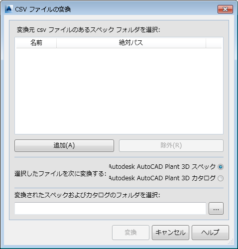 - CSV ファイルに含まれるデータに応じて、[選択したファイルを次に変換する:]の横の[AutoCAD Plant 3D toolset スペック]または[AutoCAD Plant 3D toolset カタログ]をクリックします。