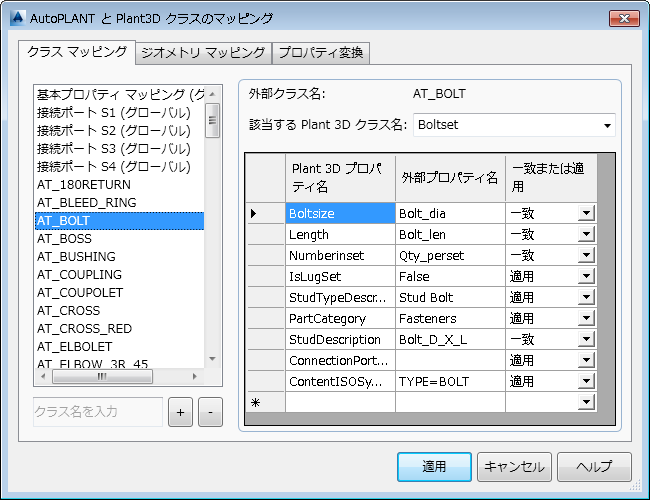 AT-BOLT AutoPLANT bolt-dia プロパティは、Plant 3D プロパティ Boltsize にマップされ、一致します。しかし、Plant 3D の値 Fasteners は PartCategory プロパティに適用されます。この例では、Bolt-dia はプロパティとして 一致していますが、Fasteners はプロパティ値として 適用されます。