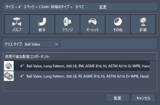 配置するコンポーネントを指定します。現在のスペック、サイズ、終端のタイプ、クラスのタイプと一致する配管コンポーネントのリストを表示します。