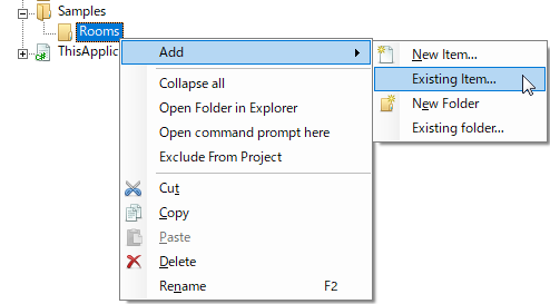 Revit IDE に戻ります。プロジェクト エクスプローラ(この例を引き続き使用)で、マクロ用に作成したフォルダを右クリックして、メニューから[追加]